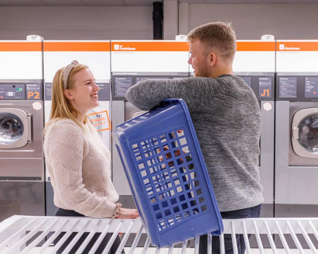 Itsepalvelupesuloisaamme peset ja kuivaat isonkin määrän pyykkiä kätevästi kauppareissun ohessa.